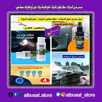 احصل على عرض متكامل للعناية بسيارتك، يشمل مسدس غسيل، منظف فوانيس، ملمع تابلوه، وأربع قطع بلف جمجمة مضيء. العرض المثالي للحفاظ على نظافة وأناقة سيارتك