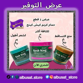 استمتعي بعرض 3 قطع من حمام كريم كيش كينج(لتساقط لشعر+لزيادة طول الشعر+لكثافة الشعر) 🛍️، الحل المثالي للحصول على شعر صحي وقوي. مع تركيبته الفعالة من الأعشاب الهندية والألوفيرا، يساعد في ترطيب الشعر ومنع التساقط بشكل ملحوظ . احصلي على شعر ناعم، كثيف ولامع مع عرضنا المميز اليوم! ✨