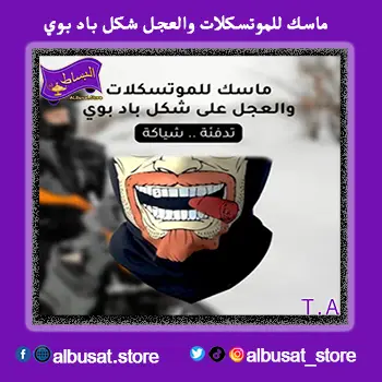 ماسك للموتوسيكلات والعجل بشكل باد بوي هو الخيار الأمثل لعشاق المغامرة والمظهر الجريء. 🏍️💨 يتميز بتصميم عصري يوفر حماية من الأتربة والرياح، مع الحفاظ على الراحة والتهوية. احصل على ماسك باد بوي الآن لتجربة قيادة مريحة وأنيقة مع حماية فائقة أثناء رحلاتك بالدراجة أو الموتوسيكل.🏍️🔥